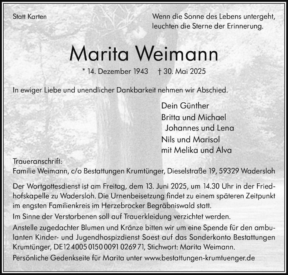 Einen lieben Menschen zu verlieren, tut immer weh und ist für die Hinterbliebenen sehr schmerzvoll. Aber die Gedanken an Marita sollten sie weiterleben lassen.